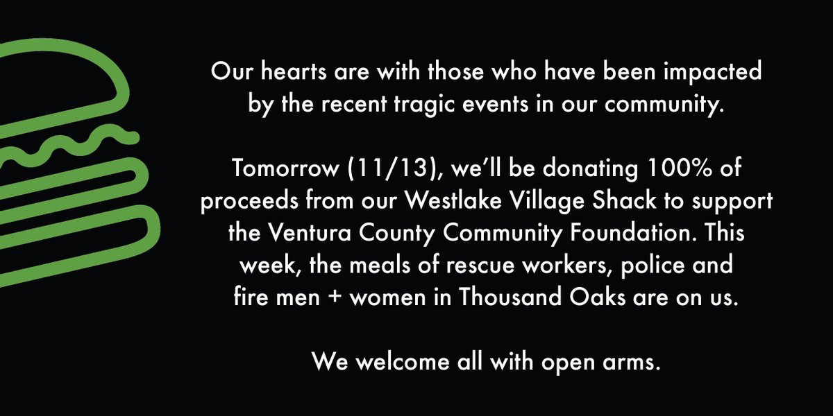 Tuesday, Nov. 13, 2018 – Shake Shack will be donating 100% of the proceeds from the Westlake Village Shack to support the Ventura County Community Foundation. And all meals of rescue workers, police and firefighters in Thousand Oaks are free all week. Thank you, Shake Shack!!