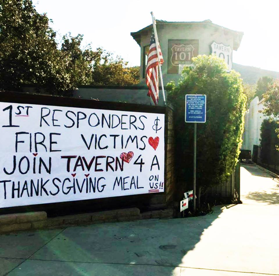 Thursday, Nov 22 – Agoura Hills – Chef and owner Marco Gonzalez of Tavern 101 has been doing an amazing feeding first responders who have been battling the fires and keep our community safe. Marco is doing it again and opening the doors to his doors and working on Thanksgiving to give free meals to fire victims, police and fire fighters.