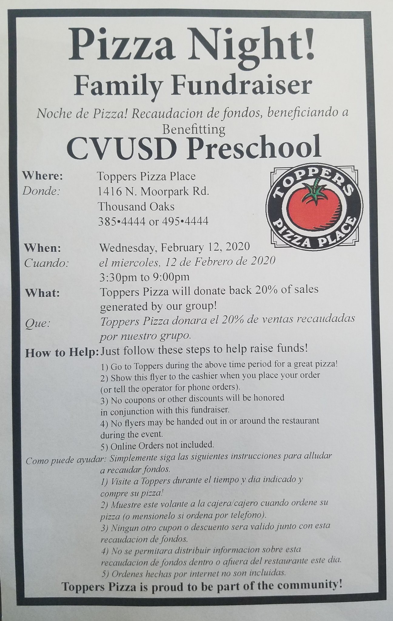 Treat the Fan to Pizza at Toppers in Wednesday – Thousand Oaks Dine at Toppers Pizza this Wednesday and CVUSD preschool benefits. Bring flier. Share on Facebook Share Share on TwitterTweet You Might Also Like Share a Slice and Help Borderline Victims (Thousand Oaks) November 14, 2019 Borderline Victims and Families Benefit When You Dine at Regal Cinema Plaza – East Simi Valley November 13, 2018 Chomp with Chopsticks at Panda Express for TOHS Band! November 6, 2018